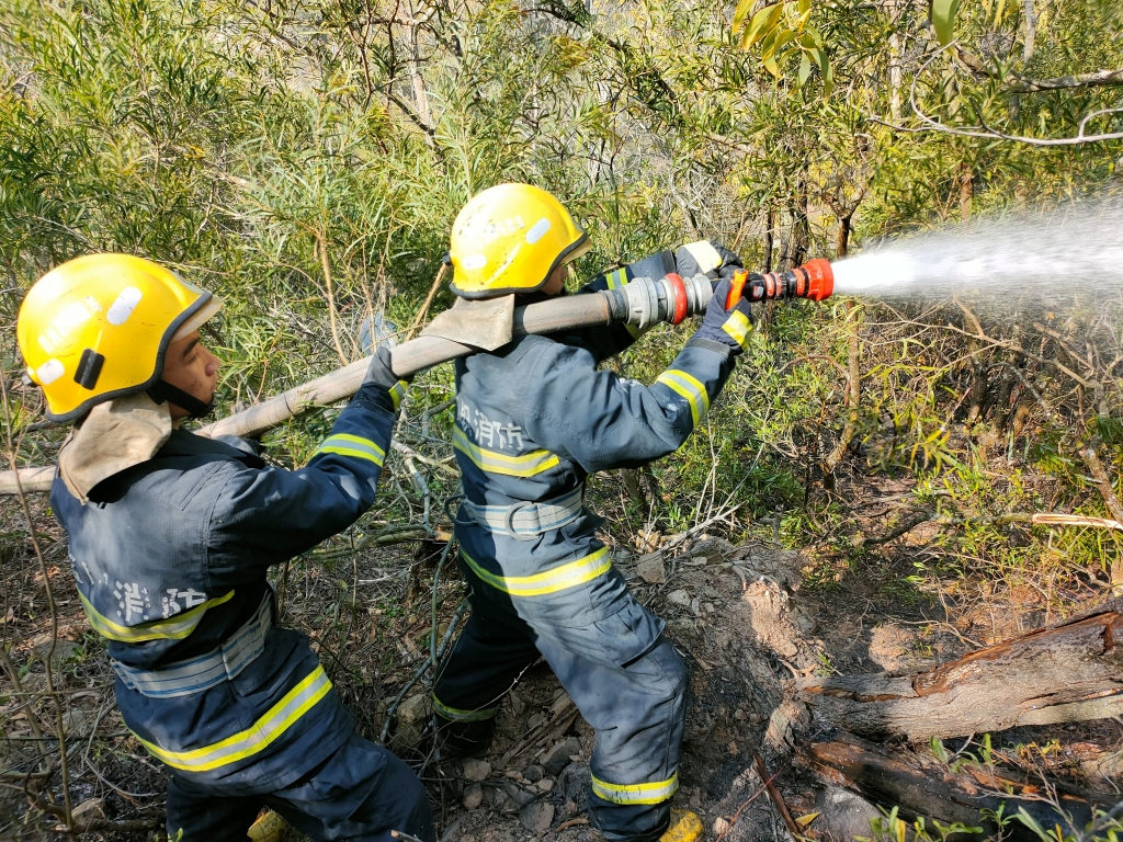 時間就是生命,海騰消防隊根據執(zhí)勤情況,立即出動6名消防戰(zhàn)斗員和一臺18噸水罐車前往古雷頭燈塔滅火。抵達現場后,值班隊長根據現場著火情況,科學部署滅火方案,出一條干線從燈塔大門左側上風口鋪設進行滅火,出另一條干線往建筑物上方鋪設從上往下出水進行滅火。在海騰消防隊、岱仔消防隊和森林消防隊的共同努力下,山火終被撲滅。