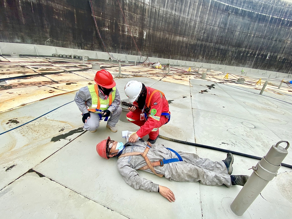 【受限空間演練】本次演練模擬施工人員在外浮盤(pán)噴砂作業(yè)因高溫中暑暈倒,現(xiàn)場(chǎng)監(jiān)護(hù)發(fā)現(xiàn)后立即報(bào)告并疏散無(wú)關(guān)人員。受限空間人孔監(jiān)護(hù)員穿戴好SCBA入罐進(jìn)行氣體檢測(cè),并通知現(xiàn)場(chǎng)消防監(jiān)護(hù)做好進(jìn)罐救援準(zhǔn)備。氣體檢測(cè)合格后,消防隊(duì)員穿戴空呼,帶上擔(dān)架、安全繩等工具進(jìn)入受限空間,將暈倒人員轉(zhuǎn)移至空曠場(chǎng)地,實(shí)施心肺復(fù)蘇、人工呼吸等急救措施,并送醫(yī)治療。
