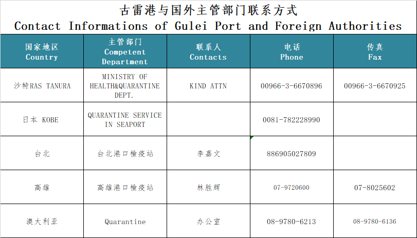 古雷港區(qū)與國外口岸主管部門通訊錄: