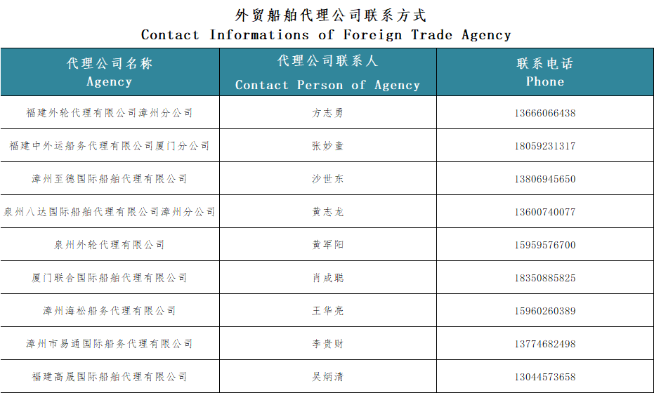 在古雷港區(qū)負(fù)責(zé)外貿(mào)船代業(yè)務(wù)的公司有9家,其詳細(xì)聯(lián)系方式如下: