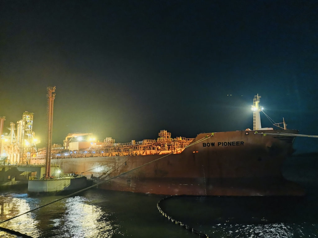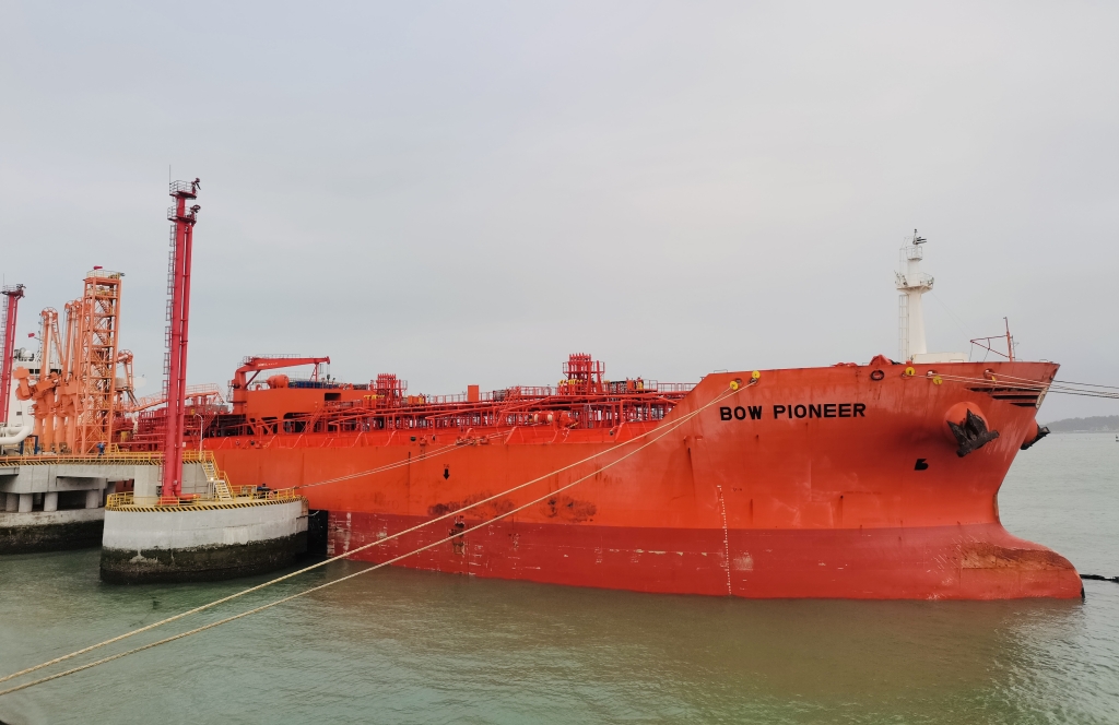 4月4日20時許,“BOW PIONEER 寶先鋒”輪靠妥在海騰碼頭南2泊位準(zhǔn)備進(jìn)行13695噸石腦油卸船作業(yè)。本次作業(yè)是海騰碼頭首次通過新建的管線向古雷石化碼頭儲罐卸石腦油作業(yè)。