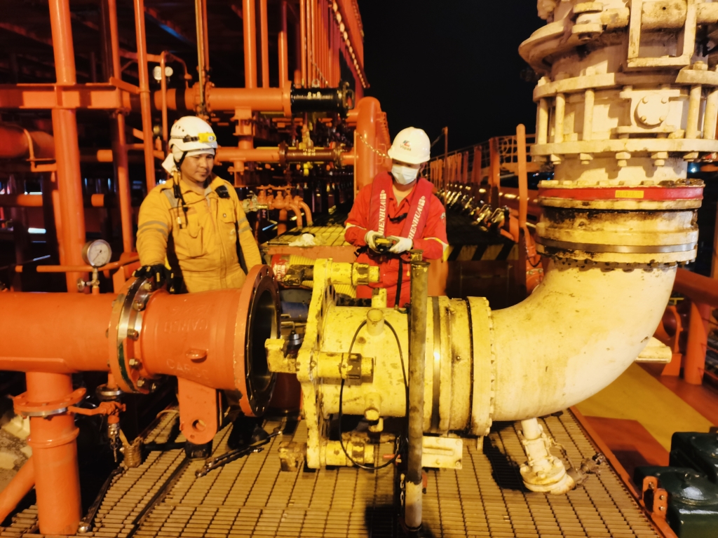 邊檢放行后,海騰碼頭根據(jù)碼頭管線及接收儲罐狀態(tài),積極與船方大副溝通協(xié)調(diào),共同制定安全高效的作業(yè)方案并做好輸油臂對接工作。卸船過程中,海騰操作部對輸油臂狀態(tài)、卸船流量、管線壓力等相關(guān)作業(yè)設(shè)備參數(shù)實時跟蹤監(jiān)控,與船方及古雷石化碼頭保持密切溝通,確保卸船作業(yè)安全平穩(wěn)進(jìn)行。