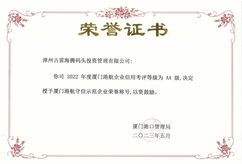 海騰碼頭將以此為契機(jī),嚴(yán)格履行安全生產(chǎn)主體責(zé)任,努力創(chuàng)造優(yōu)良的港口營(yíng)商環(huán)境,不斷提升港口管理和服務(wù)水平,持續(xù)積累信用財(cái)富,為廈門港古雷港區(qū)發(fā)展蓄勢(shì)賦能。